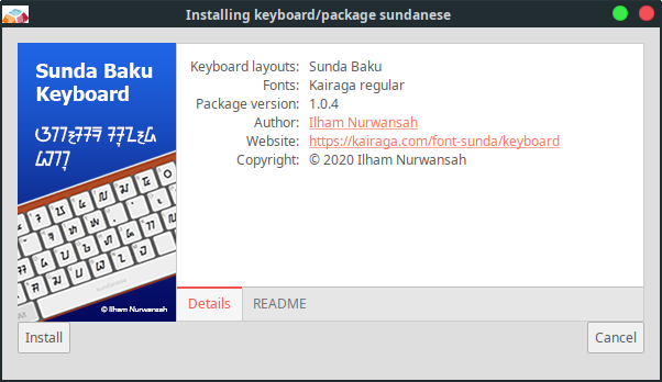 Setelah keyboard Sunda Baku dipilih maka akan muncul jendela pemasangan. Klik Install untuk memasang. Keyboard Sunda Baku ini sudah dilengkapi dengan font Kairaga Regular, sehingga otomatis akan terinstal ke dalam sistem komputer.